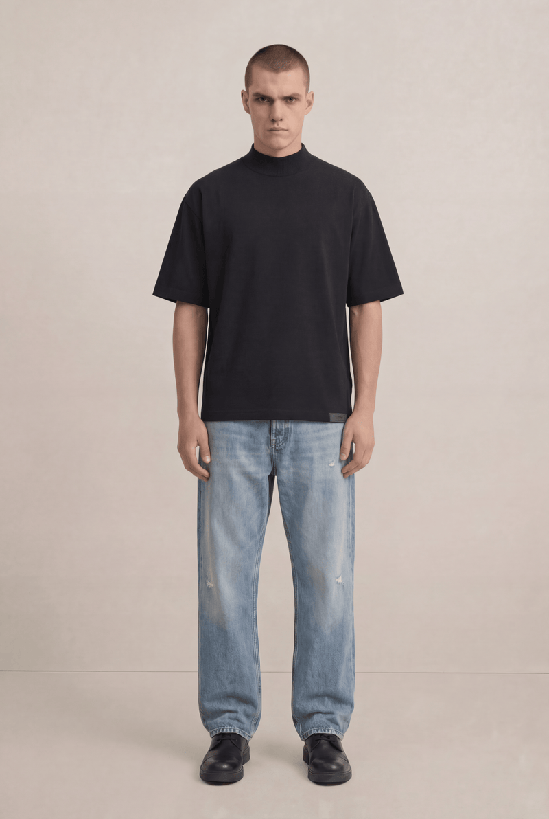 Front view of the Black Mock Neck Cotton T-Shirt showcasing its minimalist design and relaxed fit, ideal as a versatile base layer.