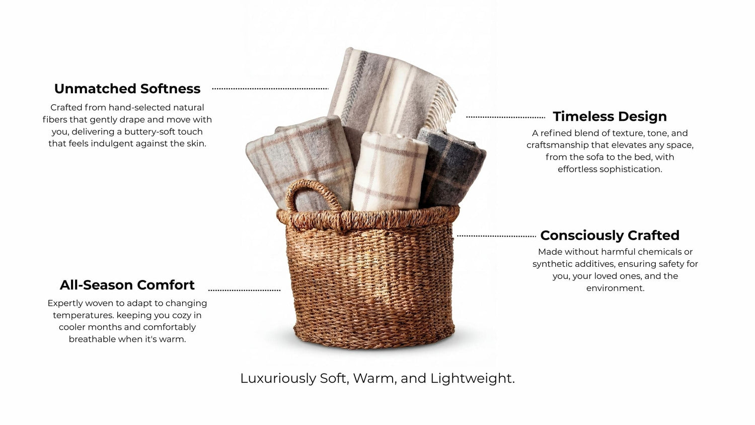 Elaborada con una mezcla premium de 55 % alpaca y 45 % lana, ofrece una suavidad y durabilidad excepcionales. Diseñada en Canadá con inspiración en la elegancia atemporal y la belleza natural, y confeccionada con maestría en Perú por artesanos expertos, esta manta combina la artesanía tradicional con una comodidad duradera.