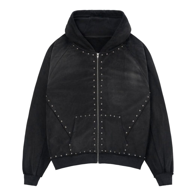 Unisex black hoodie with front zip and metal studs, made from 100% cotton for a vintage rugged look. Features kangaroo pockets and ribbed cuffs.