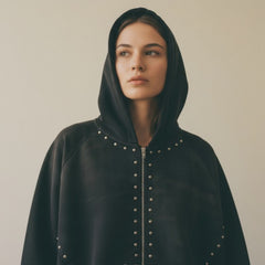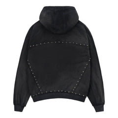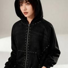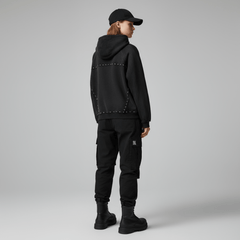 Rear view of female model in black studded zip-up hoodie. Features vintage-style stud accents and a modern streetwear silhouette.