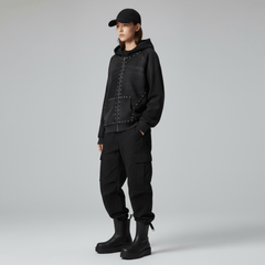 Male model wearing unisex black studded zip-up hoodie styled with black cargo pants. Rugged streetwear look with vintage cotton texture.