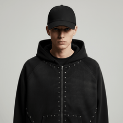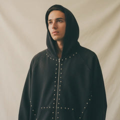 Close-up of male model in black hoodie with metal studs and zip closure. Heavyweight cotton hoodie with a bold, structured silhouette.